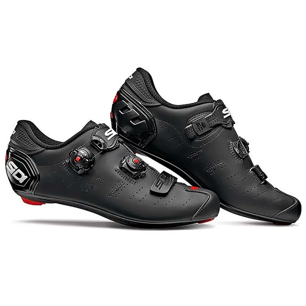 Одни из самых популярных шоссейных туфель Sidi Ergo 4 получили дальнейшее развитие, и теперь ценителям качественной высокопроизводительной обуви доступна новая версия Sidi Ergo 5 с композитной жёсткой колодкой и усовершенствованной системой шнуровки Tecno-3 Push, что ещё больше приблизило эту модель к легендарным топовым Sidi Wire, где используются аналогичные фиксаторы. Легкие жёсткие Ergo 5 по достоинству оценят профессиональные гонщики и энтузиасты. Для обеспечения максимальной передачи энергии Sidi разработали колодку Twelve Carbon Composite, состоящую из нейлоновой матрицы и наполняющего углеродного волокна. В результате получилась жёсткая водонепроницаемая и механически стабильная основа. Это значит, что туфли не подвержены изменению жёсткости в процессе старения, длительного использования, а также не восприимчивы к изменениям температуры или влажности. Верх Ergo 5 состоит микрофибры Techpro сделанной в Италии. Этот лёгкий дышащий высокотехнологичный материал устойчив к износу, обладает водоотталкивающими и антибактериальными свойствами. Соответствует европейским стандартам качества, не содержит вредных химических веществ и является экологически чистым материалом. Обувь Sidi славится своим комфортом. Для обеспечения максимальной мягкости и равномерности распределения давления на ногу используется широкий анатомически изогнутый ремень. Система регулируется с обеих сторон для соответствия размеру и подъёму стопы. Получила усовершенствование и система шнуровки. Теперь по всему подъёму используется технология Sidi Tecno-3 Push, что позволяет более равномерно и точно регулировать фиксацию ноги на ходу. Красная кнопка по центру фиксатора служит для открытия пряжки одним нажатием и быстрой настройки - не отвлекаясь от дороги и не сбавляя темпа. Механизм изготовлен из запатентованных материалов Sidi Wire, а его надёжность проверена профессионалами по всему миру. При необходимости мелкие детали велотуфлей Sidi легко заменяемы на новые. Ремень на липучке также важен при обеспечении идеальной посадки, поэтому внутренняя часть имеет зубцы для максимально стабильной фиксации соединения. Ergo 5, как все топовые модели Sidi, имеет механизм затягивания верхней части задника для оптимальной фиксации пятки без проскальзывания во время крутых подъемов или спринтов. Анатомическая форма усиленной нижней части обеспечивает поддержку пятки и позволяет повысить передачу мощности. Ergo 5 - гоночная предтоповая модель. Основные отличия от более простых вариантов обуви заключаются в типе колодки, качестве микрофибры, шнуровке Tecno-3 Push по всему подъёму ноги для точной подгонки и в наличии регулировочного механизма пятки.